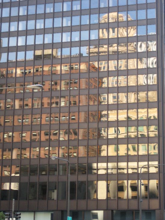 Weerspiegeling van oude gebouwen in nieuwe gebouwen. |