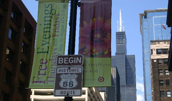 Het officiele begin van Route 66 Weggepropt in een zij straat. |