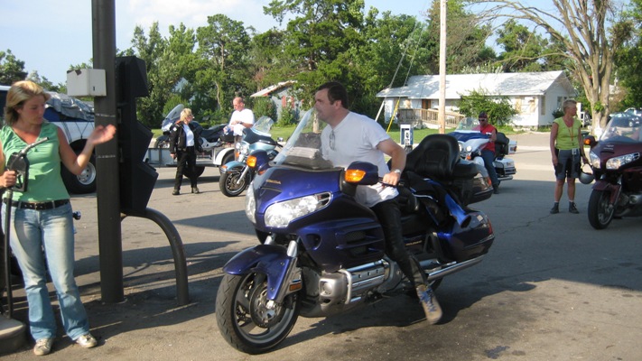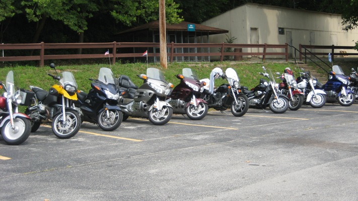 Parkeren vraagt altijd heel wat ruimte met 19 motoren en een auto met aanhanger. |