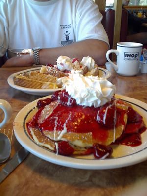 Tsjonge, dat was wel een heel lekker ontbijt bij de IHOP (the International House of Pancakes). Pannenkoeken en wentelteefjes met aardbeien, aardbeiensaus en slagroom. Heerlijk.